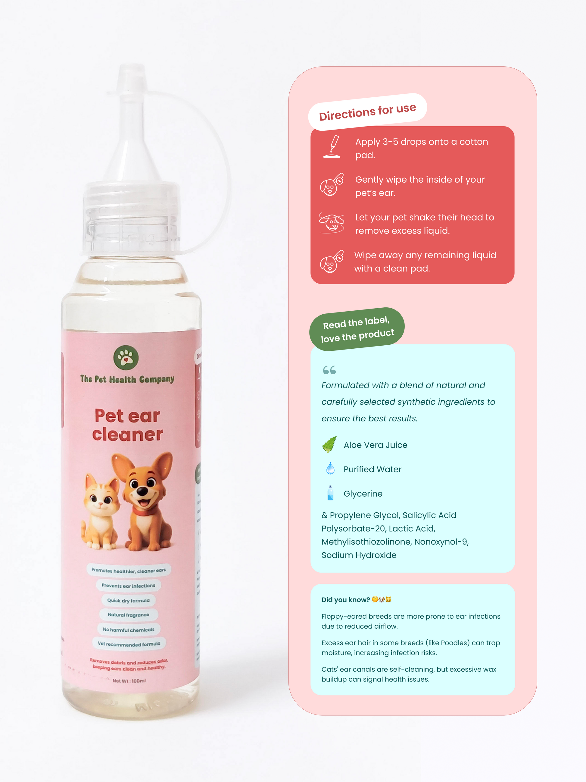 👂 Pet Ear Cleaner (100ml) : Removes debris, reduces odor, and promotes healthy ears in both dogs and cats. Made with aloe vera juice, a soothing natural fragrance, and a vet-approved quick-dry formula, it cleans without irritation and keeps ears fresh and comfortable.
